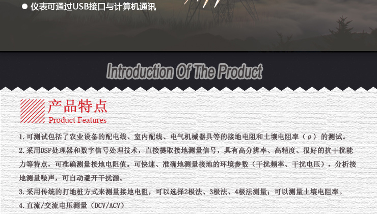 ①地樁法:采用傳統的打地樁方式來測量接地電阻,可以選擇2極法、3極法、4極法測量;可以測量土壤電阻率。