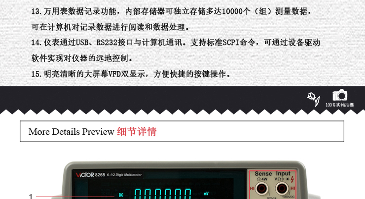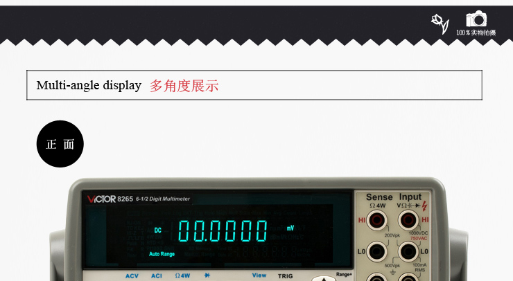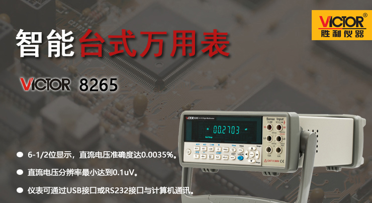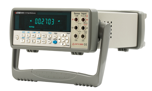 VICTOR 8265是一款智能臺式真有效值萬用表,本儀表有4-1/2位、5-1/2位、6-1/2位顯示分辨率,最高顯示讀數值±1200000字,基本直流電壓準確度高達0.0035%。
