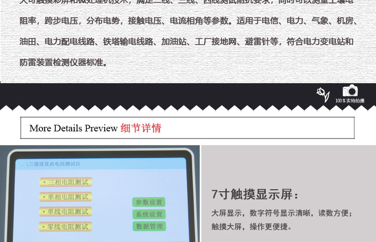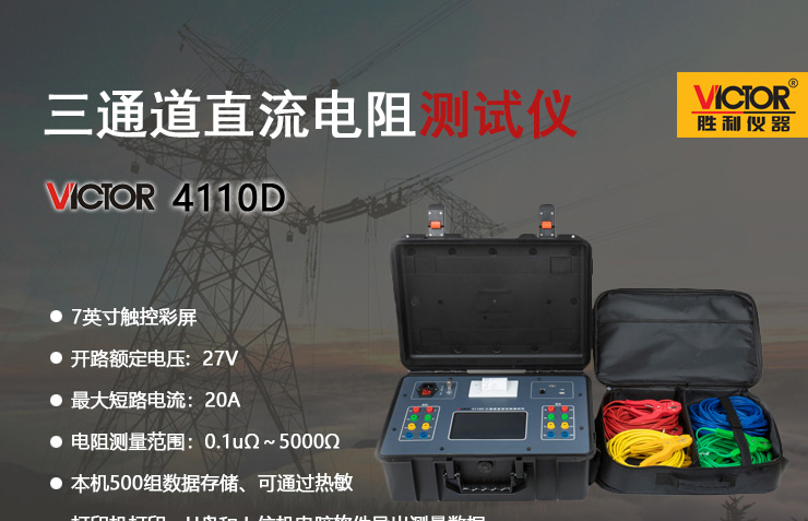 VICTOR 4110D三通道直流電阻測試儀又名工頻接地電阻測試儀、接地電阻表等是檢驗測量接地電阻常用儀表的常用儀表。它采用了新型變頻交流電源、雙頻測量技術、超大可觸摸彩屏和微處理機技術,滿足二線、三線、四線測試阻抗要求,同時可以測量土壤電阻率,跨步電壓,分布電勢,接觸電壓、電流相角等參數。適用于電信、電力、氣象、機房、油田、電力配電線路、鐵塔輸電線路、加油站、工廠接地網、避雷針等,符合電力變電站和防雷裝置檢測儀器標準。儀表測試精準、快速、簡捷、穩定可靠等特點。
