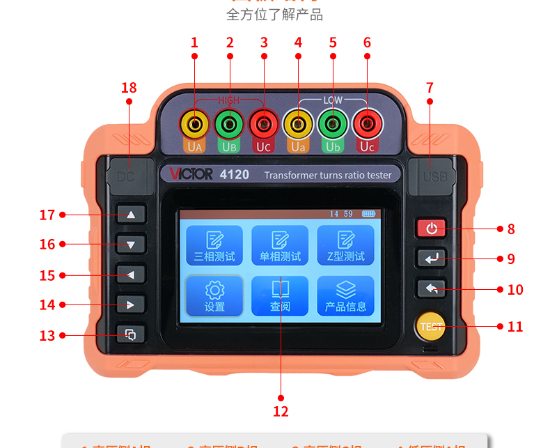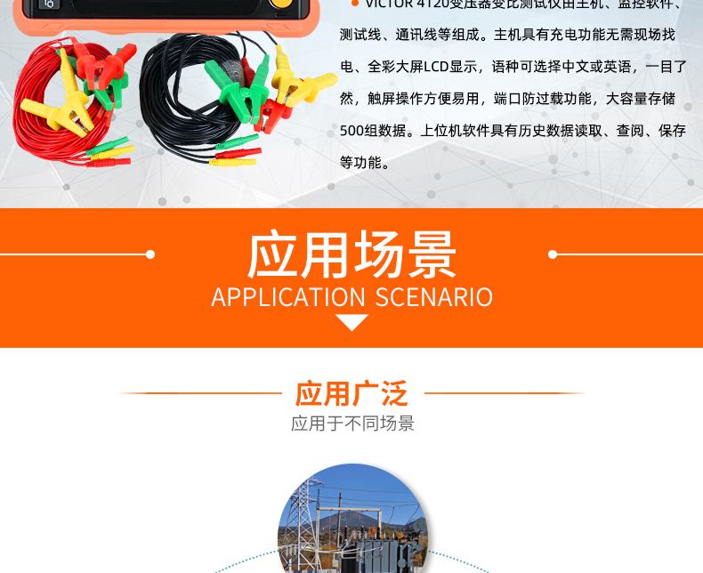 VICTOR 4120變壓器變比測試儀由主機、監控軟件、測試線、通訊線等組成。主機具有充電功能無需現場找電、全彩大屏LCD顯示,語種可選擇中文或英語,一目了然,觸屏操作方便易用,端口防過載功能,大容量存儲500組數據。上位機軟件具有歷史數據讀取、查閱、保存等功能。
