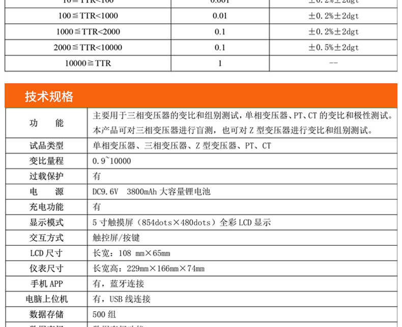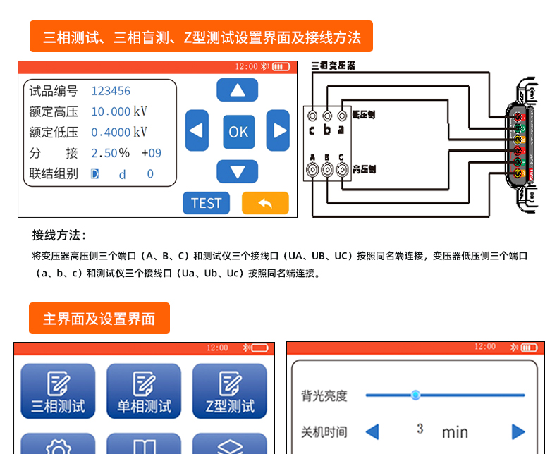 主要用于三相變壓器的變比和組別測試,單相變壓器、PT、CT的變比和極性測試。本產品可對三相變壓器進行盲測,也可對Z型變壓器進行變比和組別測試。 |