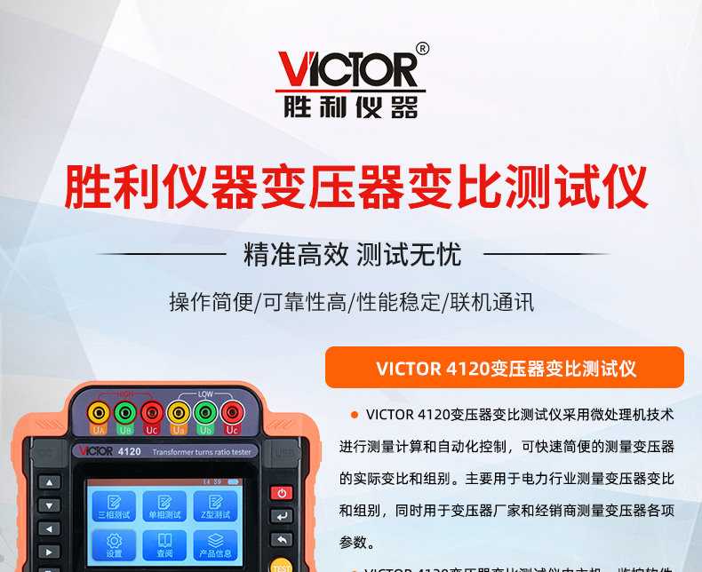 VICTOR 4120變壓器變比測試儀采用微處理機技術進行測量計算和自動化控制,可快速簡便的測量變壓器的實際變比和組別。主要用于電力行業測量變壓器變比和組別,同時用于變壓器廠家和經銷商測量變壓器各項參數。
