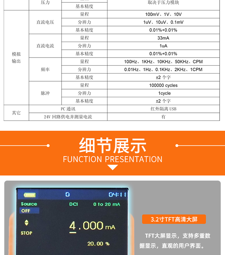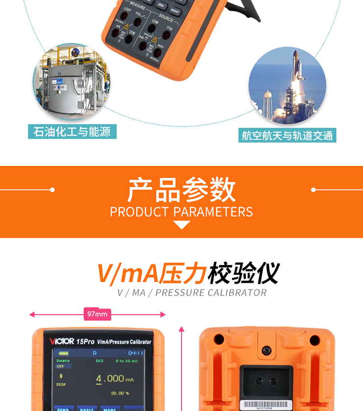 VICTOR 15Pro VmA壓力校驗儀是一款0.02%精度的高性能過程校驗儀,具有模擬輸出直流電壓、直流電流、模擬變送器、頻率、脈沖個數等功能,同時具備測量直流電壓、直流電流、頻率、通斷測試以及壓力測量等功能;該儀表開放通訊協議,便于二次開發。