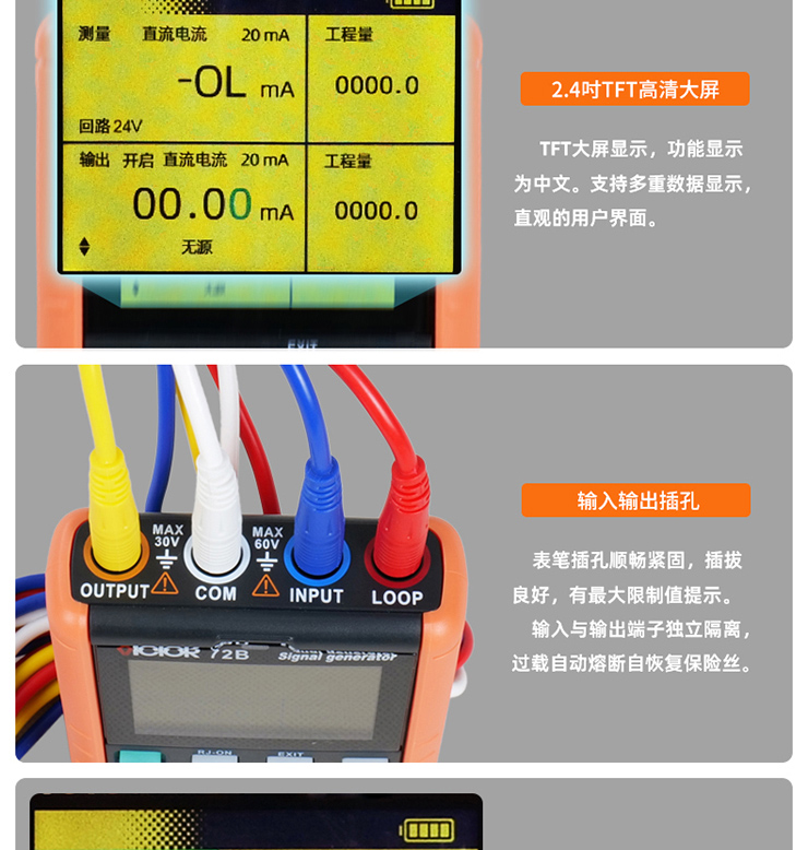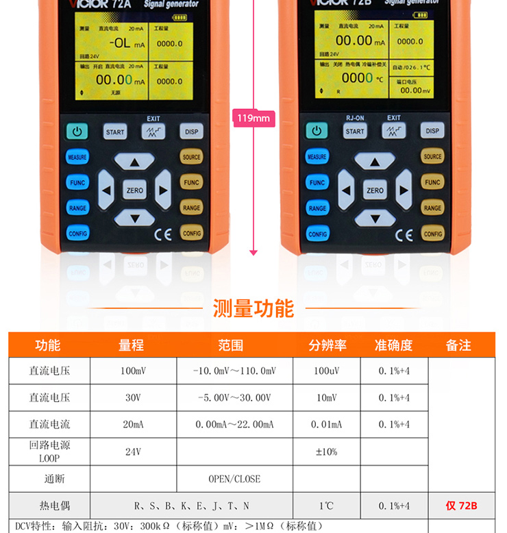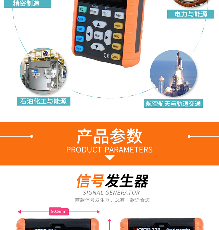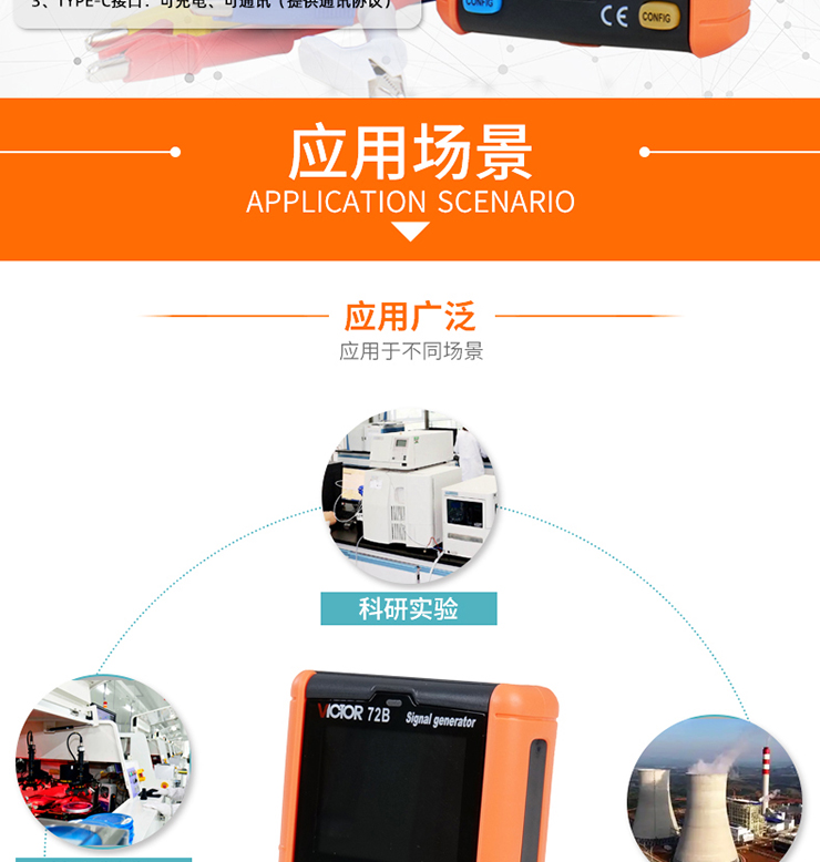 信號(hào)發(fā)生器,可用于測(cè)量直流電壓、直流電流、通斷,可模擬輸出直流電壓、直流電流、熱電偶、頻率。適用于現(xiàn)場(chǎng)變送器、DCS、PLC等系統(tǒng)的調(diào)試和校準(zhǔn)。VICTOR 72B在石油化工、生物制藥、工業(yè)自動(dòng)化、大專院校和科研機(jī)構(gòu)等領(lǐng)域的得到了廣泛的應(yīng)用,是工程師、技術(shù)工人及科研人員的“口袋級(jí)”實(shí)用工具。