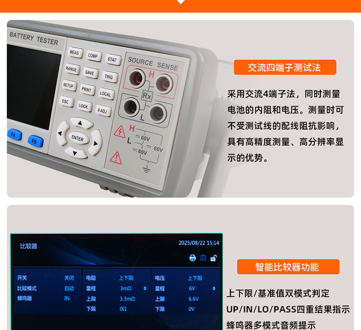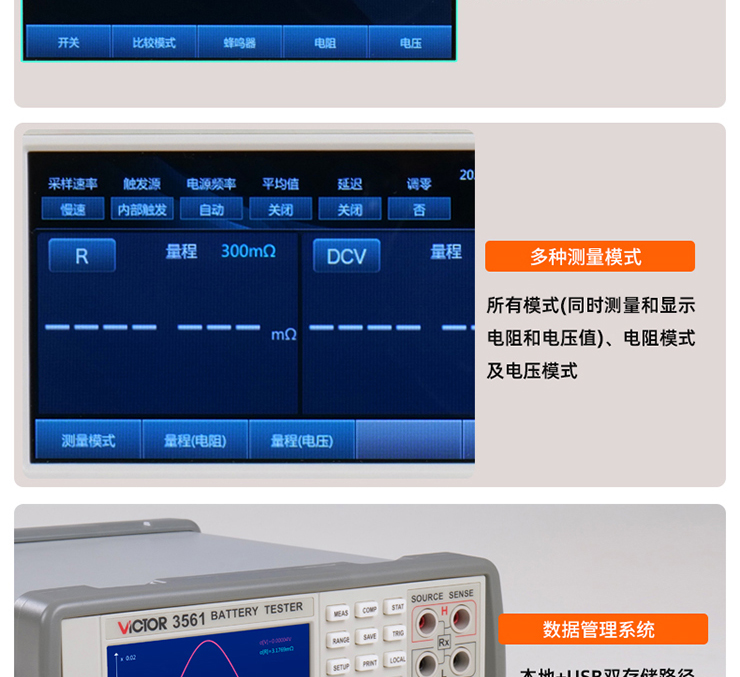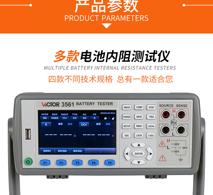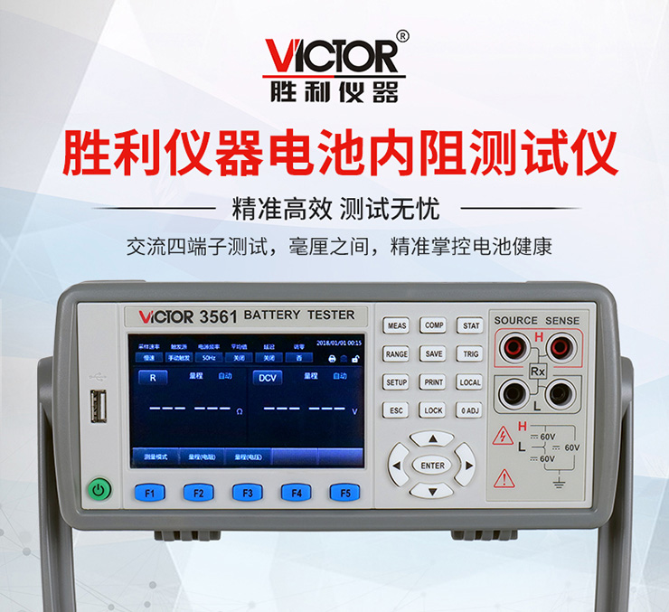 VICTOR 3562 電池內阻測試儀廣泛應用于手機鋰電池、蓄電池以及動力電池等各種電池的測試。采用交流四端子測試方法,可更精準地測試電池的內阻和電壓。內建比較器功能,可自動判斷電池參數是否符合標準,以便統計合格率,適合各種電池檢測和分揀的場景。