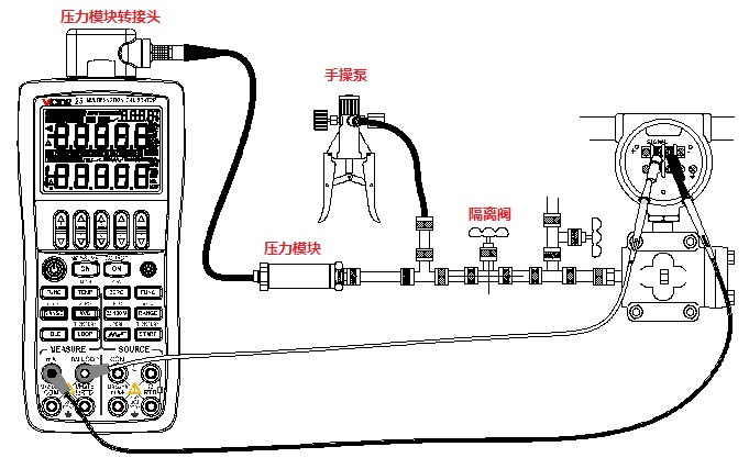 將VICTOR 25的輸入設(shè)置為提供回路電壓同時(shí)測(cè)量電流,輸出設(shè)置為壓力,通過(guò)改變外部壓力源的輸出壓力,便可對(duì)壓力變送器進(jìn)行校準(zhǔn)。