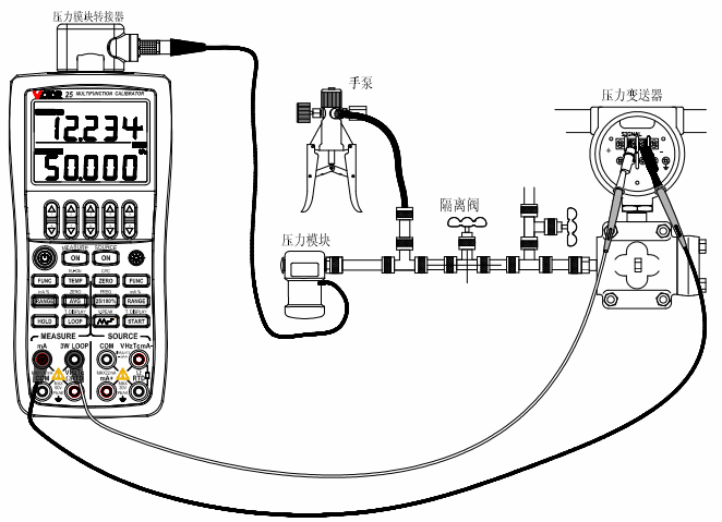 將VICTOR 25多功能校驗儀的輸入設置為提供回路電壓同時測量電流,輸出設置為壓力,通過改變外部壓力源的輸出壓力,便可對壓力變送器進行校準。