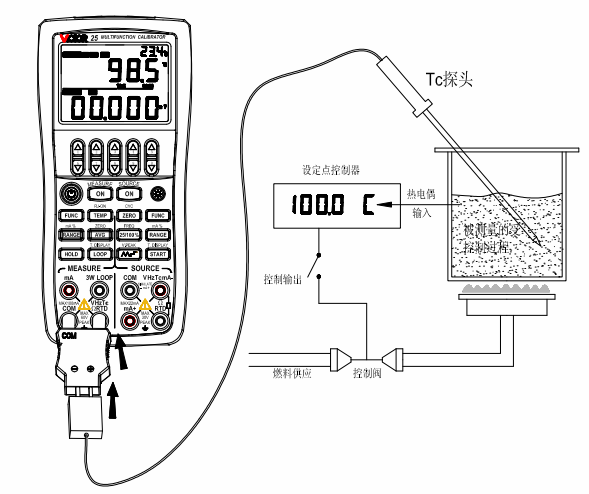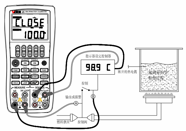 如圖所示,VICTOR 25輸出一個TC的溫度信號,輸入設置為開關量檢測功能。緩慢的改變VICTOR25的輸出溫度,當開關由斷開變為閉合時,VICTOR 25發出一聲響,顯示‘close’,這時輸出的溫度值為使控制器輸出節點閉合的溫度值。記下此時VICTOR 25的輸出值,再緩慢以相反的方向改變輸出值,當VICTOR 25再次發出聲響并顯示‘open’ 時觀察輸出節點斷開時VICTOR 25的輸出值,它與上一個動作值之差為控制器的輸出報警回差。